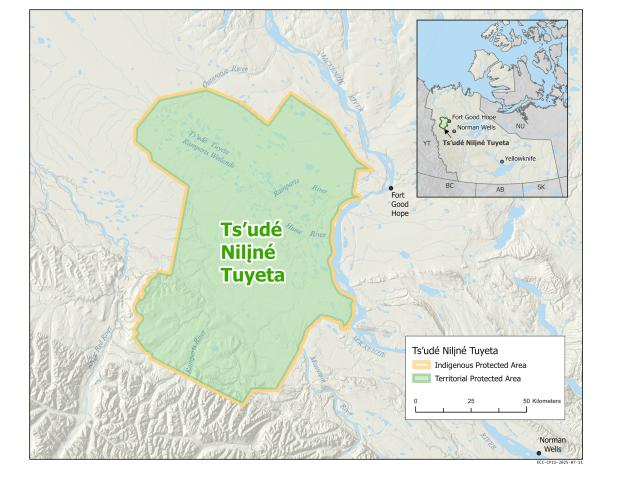 Ts’udé Nilįné Tuyeta - meaning ‘big tree river wetland,’ in Dene Kǝdǝ, the language of the K’áhshó Got’ı̨nę - is a 10,100 square kilometer Indigenous Protected Area that fully overlaps with a Territorial Protected Area.