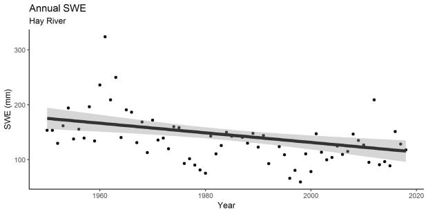 In Hay River, there have been no decipherable trends in total annual precipitation or total annual rain, since 1950. However, from 1950 to 2018 there was a decreasing trend observed in total annual SWE (Figures 8, 9 and 10).