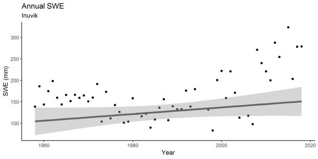 In Inuvik, there were no trends detected in total annual precipitation or total annual rain. There was an observed increasing trend in total annual SWE between 1955 and 2018 (Figures 14, 15 and 16).
