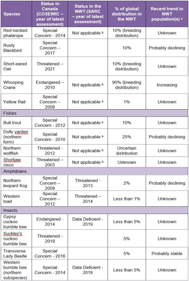 Table 1: Species, conservation status as assessed by COSEWIC in Canada and by SARC in the NWT, the percent of the global distribution in the NWT, and the most recent trend in populations occurring in the NWT. Recent trends are summarized from the most recent COSEWIC or SARC status report for each species. Source: Ref. 1, 2.